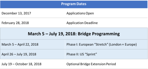 The Hans Investment Limited Bridge @ Columbia University begins in early March 2018 and ends in mid-July. The first 6 weeks will be spent in London preparing each startup for serious international expansion. The remaining 14 weeks of intensive programming will be based in NYC’s Silicon Alley (Manhattan), which acts as a launching pad for developing business in additional North American markets including Chicago, Los Angeles, San Francisco and Toronto. Startups then have an option to extend the NYC portion of the program by an additional 12 weeks. Important 2017-2018 dates include: